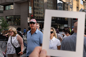 "Montreal: Frames of Reference" (2024) - Walking the streets of a major city means maneuvering through masses of people, and in doing so one can easily become anesthetized to the faces and actions of others. I find this regrettable and I often make a point to establish eye contact with people as they walk by. This photographic project, "Frames of Reference," speaks to the art of urban street politics and cultural reactions to the chance encounter with the camera. By using a simple framing device, I have created an artificial means of selecting individuals from the sidewalk crowds for interaction and observation. Ultimately, the viewer's examination of the pedestrians' faces, body language, idiosyncratic behaviors, and their palpable reactions - within the frame and beyond its borders - are documented for full consideration. By using the magnification tool the viewer can more completely examine the images. (Reduced Resolution Digital Images)